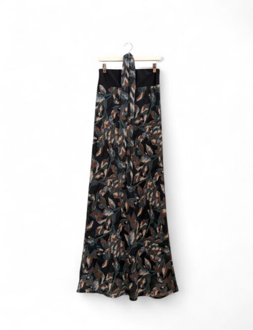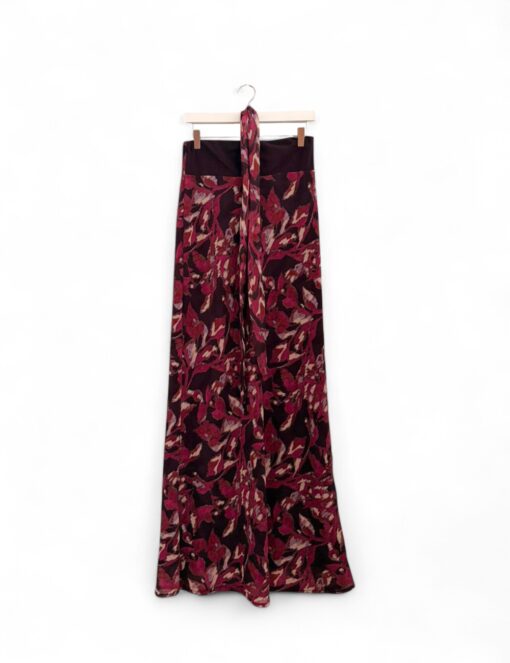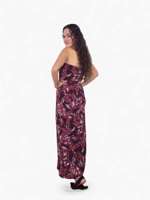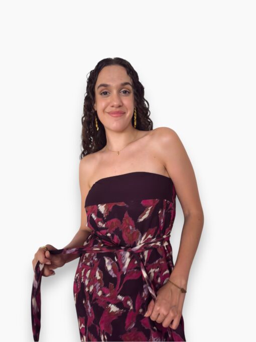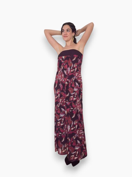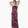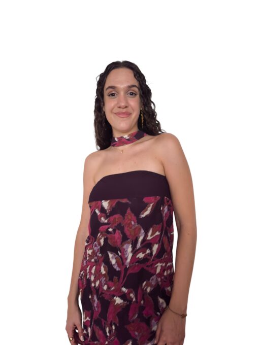 Vestido largo estampado en tejido de gasa. Escote palabra de honor y corte recto. Forro interior y lazo que puede llevarse al cuello o a la cintura.