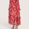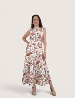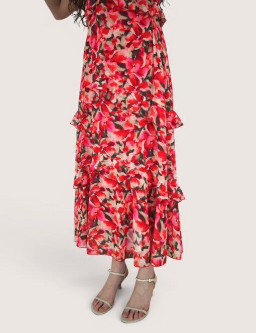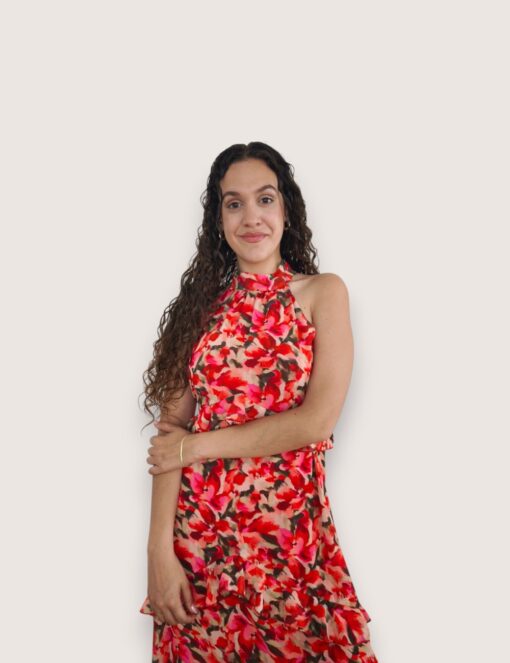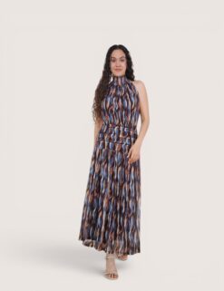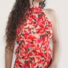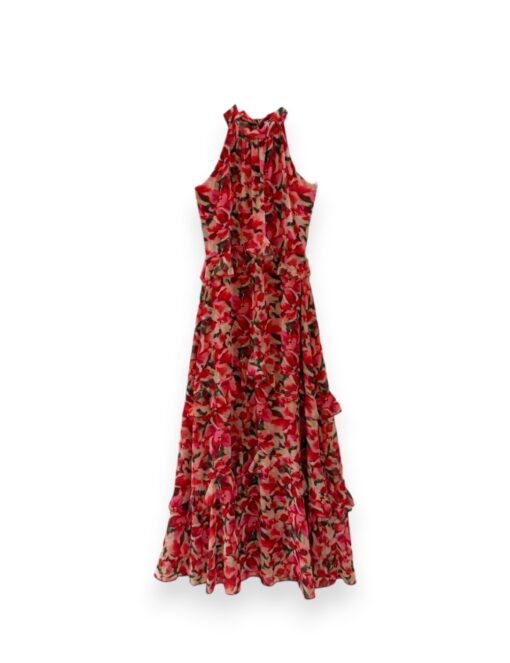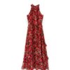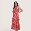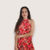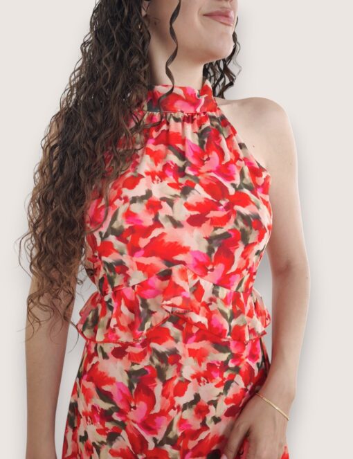 Vestido largo de gasa con estampado en tonos rojos y naranjas . Cuello halter atado y espalda al aire. Entallado en cintura y cadera. Forro interior.