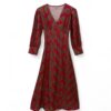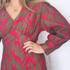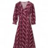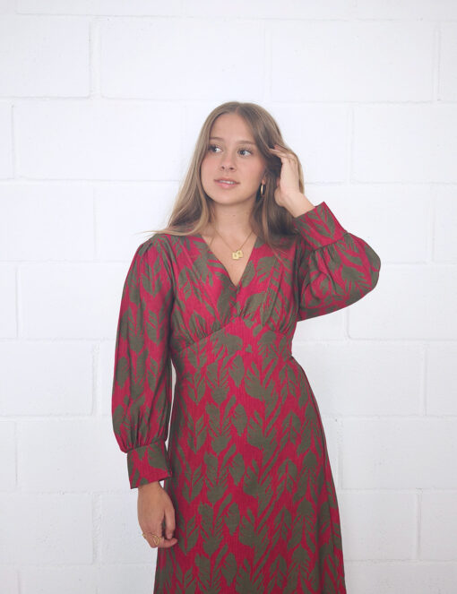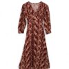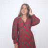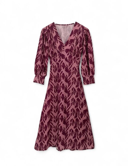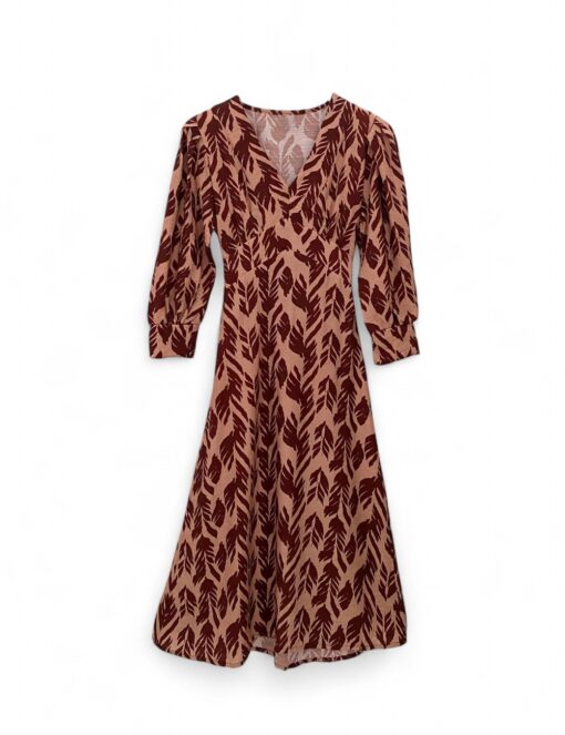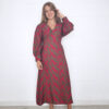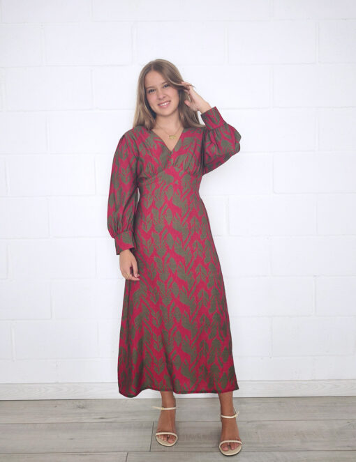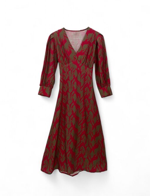 Vestido largo estampado de tejido fluido y corte imperio. Escote de pico y manga ligeramente abullonada. Cinturilla trasera elástica.
