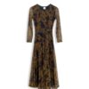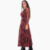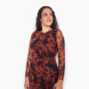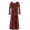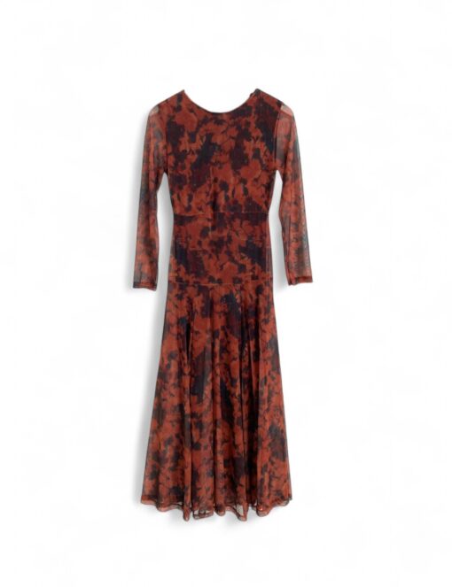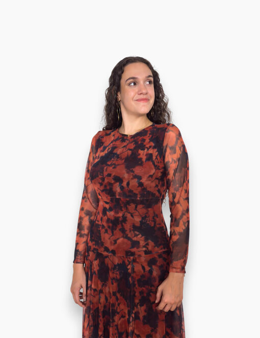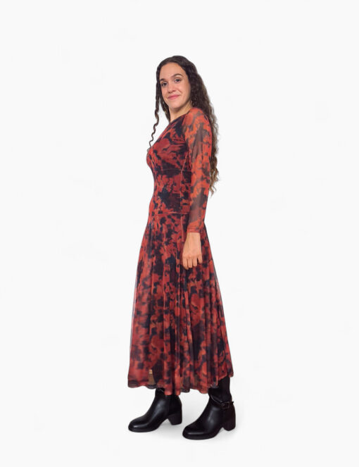 Vestido largo estampado en tejido de tul elástico. Cintura entallada y cuello redondo con cierre de botón. Vuelo en la parte inferior, manga semitransparente y forro interior.